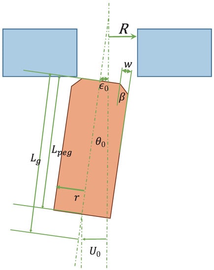 First of all, we consider geometric conditions for the peg-in-hole task. As a first condition, it was required that the peg and hole positions were adjusted to allow the peg to be inserted into the hole, as shown in Figure 16. As a permissible position error , the condition () has to be satisfied, where is the actual position error, and can be calculated as follows: