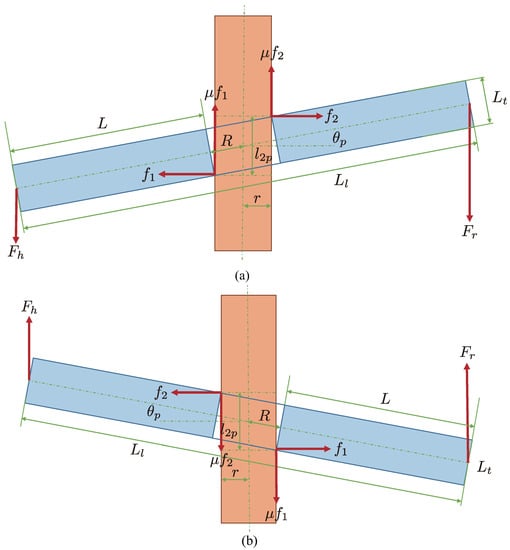 In addition, we consider the case of taking the board off of the peg. Since the friction force is the opposite to the case of the insertion, the signs of the terms and becomes the opposite (Figure 17b). Therefore, we can obtain