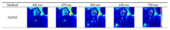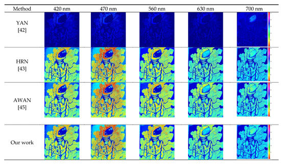 The purpose of this experiment is to verify that our double output feature CBAM is superior to other attention modules. The experiments are performed for the same batch size, the same dataset, and the same hardware device. The reconstructed results based on our framework using None, channel attention mechanism [50], spatial attention mechanism [51], the CBAM + ResNet module [47], and Our DOFCBAM at 420, 470, 560, 630, and 700 nm are shown in Figure 10. A comparison of performance is shown in Table 4.