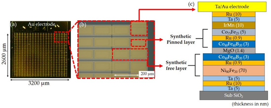 (a,b) Microscopy image of a tunnel magnetoresistance (TMR) sensor containing 500 magnetic tunnel junctions (MTJs) in series. The two pinned junctions were etched onto the bottom electrode of the free layer. (c) Stacking structure of MTJ film.