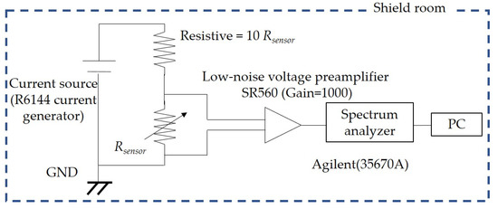Additionally, to determine the noise characteristics of sensors, a measurement system was utilized to measure the noise spectral density. Figure 2 depicts a schematic diagram of the noise measurement system. These measurements were carried out in a magnetically shielded room that provided a low-magnetic-field environment. A low noise voltage preamplifier (SR560) with a gain of 1000 was used to maximize the outputs, and a spectrum analyzer (35670A) was used to determine the noise spectral density.