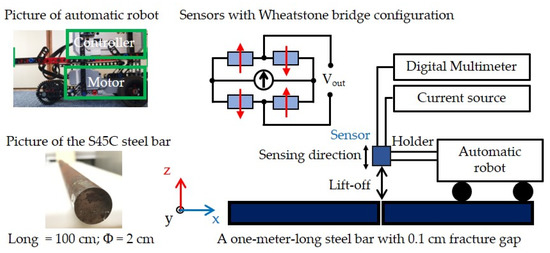 Before MFL testing, the steel bars were magnetized using a solenoid consisting of an 875-turn coil with a length of 1.44 m. A current of 2.0 A was passed through the solenoid, creating a magnetic field of approximately 15.24 Oe. Figure 3 depicts a schematic diagram of the automated MFL testing system and inspected object information in the present study. The system consists of a current source, a digital multimeter, and an automatic robot with fabricated TMR sensors. Considering the presence of a background magnetic field, measuring the z-axis component of the MFL field B was less affected by the background magnetic field when sensing variations compared to when measuring the x-axis component of B [29]. Therefore, the sensing direction (pinning direction) of the sensor was set parallel to the z-axis field, which was sensitive to changes in the z-axis component of magnetic fields. A flawless and a fractured steel bar (S45C) with a 0.1 cm fracture gap were prepared for MFL testing, respectively. The scanning was carried out with a step of 1 mm, and its length was set to 100 cm along the long direction (x-axis direction) of the steel bar. The output voltage was recorded in real-time so that the sensor can timely detect changes in the magnetic field distribution. In addition, the automatic robot was used to move the TMR sensor along the x-axis direction (long direction of the steel bar) to measure the magnetic flux signal, and the motor was equipped with a magnetic shield for suppression of impact from the motor. The lift-off (distance between the sensor and the steel bar surface) was manually adjusted along the z-axis from 4 to 20 cm. During MFL testing, the current source provided an applied current of 1 mA to the sensor, and the digital multimeter recorded the output voltage of the sensor.