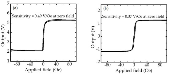(a) Outputs for one serial MTJ sensor and (b) four serial MTJ sensors connected in a full Wheatstone bridge circuit at room temperature. Sensitivity is determined by ΔV/ΔH term slope at zero field. The linear range is defined as a dynamic range with nonlinearity of 10% FS for each sensor.