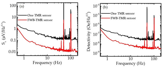 Furthermore, the noise spectral density Sv was characterized at zero field. Figure 5a shows the Sv of one serial MTJ sensor and FWB-TMR sensor. The noise of an MTJ contains several factors: amplifier, thermal-shot, electrical 1/f, and magnetic 1/f noise. Here, the electrical and magnetic 1/f noises dominate only in the low-frequency regime, whereas the thermal-shot noise as white noise presents in both the low- and high-frequency regimes. The result showed the full FWB-TMR sensor exhibited a considerably lower Sv value because the use of a bridge configuration can significantly reduce the thermal drift and the thermal-shot noise [30,31]. Since the four TMR sensors were arranged in a Wheatstone bridge configuration, the output voltage is zero at zero magnetic field, and the resistance and thermal noise for the individual sensors could be canceled in the output voltage of the FWB-TMR sensor. Consequently, compared with one serial MTJ sensor, the FWB-TMR sensor showed lower noise voltage. The detectivity D is defined as: