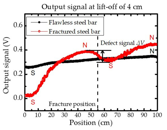 To verify the performance of the constructed MFL testing system, the one serial MTJ sensor was used to inspect a flawless and a fractured steel bar (0.1 cm gap), respectively. Figure 6 demonstrates the scan result that the z-component of magnetic flux leakage was measured, and the output signal corresponding to the change in magnetic fields. For the inspection of the flawless steel bar, since the magnetic poles induced in the magnetized steel bar, the output signal variation appeared during the scan from the left (position = 0 cm) to the right (position = 100 cm) along the x-axis. In comparison, the obvious variation appeared in the output signal when the sensor was above the fracture position (position = 55 cm). Considering that the presence of a fracture caused the magnetic flux lines to leak out from the fracture as well as magnetic poles in the steel bars, a significant disturbance of the magnetic flux intensity occurred surrounding the fracture location. Consequently, the variation was obtained between the peak and trough (ΔV) in the output signal, and the fracture position was determined.