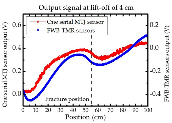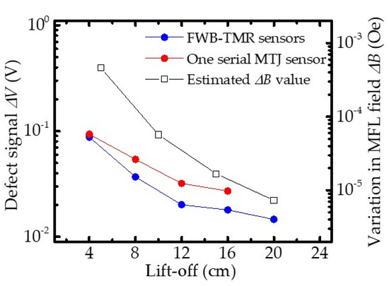 Furthermore, theoretically, a higher lift-off value reduces ΔB due to the inhomogeneous magnetic field around the inspected steel bar. According to the magnetic dipole theory, the calculated ΔBz (the z-axis component of the MFL field) should strongly depend on the lift-off value [6,32]. Figure 8 shows that the ΔV of sensors and estimated ΔBz decreased with increasing lift-off. This indicates that the dependence between ΔV and lift-off value agrees well with the theoretical predictions that the estimated ΔB decreases as the lift-off value increases. Moreover, thanks to the high sensitivity, the one TMR sensor exhibited higher ΔV values in detecting ΔB with various lift-off values compared with the FWB-TMR sensor. However, due to the higher noise voltage, the measurement with one serial MTJ sensor failed to obtain ΔV after lift-off of 16 cm, whereas ΔV was obtained by the FWB-TMR sensor. As a result of the clear ΔV in the output, the fracture could be located by the FWB-TMR sensor even at lift-off of 20 cm.