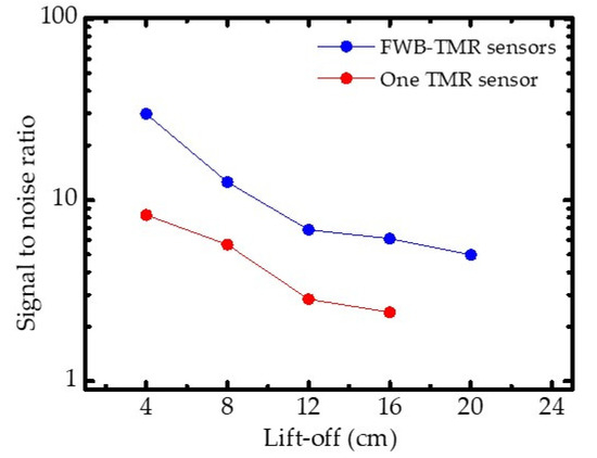 Figure 9 shows the dependence of SNR on the lift-off when detecting a fracture with different sensors. When the lift-off was set to 4 cm, both sensors determined the presence of a fracture, providing an SNR of 9 and 30 dB for fracture detection for the serial MTJ and FWB-TMR sensors, respectively. Since ΔV strongly depends on the lift-off value in MFL testing, the dependence of SNR values on lift-off is similar to that of ΔV on lift-off for both sensors. However, the SNR values were impacted by the background field (earth’s magnetic field) and the noise characteristics of devices in the MFL system. Although the one serial MTJ sensor could detect a minimum field of 10−6–10−7 Oe at a frequency of 1–10 Hz in a magnetically shielded room, it failed to determine the presence of fracture at lift-off of 20 cm, due to the high noise caused by the background field in the MFL testing system. As the FWB-TMR sensor showed lower noise spectral density and had much better detectivity to sense external fields, the SNR of 4 dB was obtained and the defect presence was successfully determined when the FWB-TMR sensor was used to inspect the fractured steel bar at lift-off of 20 cm. This suggests that the FWB-TMR sensor can detect fracture gap of steel bars in MFL testing at high lift-off.