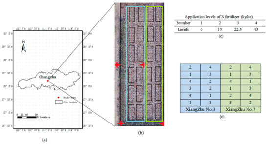 Study area and arrangement of the experimental sites: (a) geographic map of the study area, (b) experiment fields for ramie, (c) nitrogen fertilizer application levels represented by number, and (d) nitrogen fertilizer application levels in each plot.