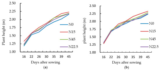 After the first 20 days, the difference in ramie plant height under different N levels began to increase. The plant heights of both ramie varieties at four different N levels ranked as follows: N15 > N45 > N22.5 > N0. The ramie plant height without any fertilizer application was the minimum. The ramie treated with N15 exhibited the maximum plant height. The results indicated that the ramie plant heights were related to the N levels, and they could be increased by applying an appropriate amount of nitrogen fertilizer; therefore, it is necessary to monitor ramie growth under different N treatments so as to improve the N fertilizer utilization efficiency in the field.