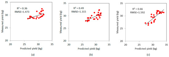 Estimation results of the ramie yield by using the multiple linear regression model and stepwise linear regression models. (a) Stepwise linear regression model only including the plant number, (b) stepwise linear regression model including the plant number and plant height, and (c) the multiple linear regression model.