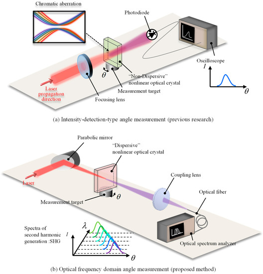 Before discussing the theoretical approach, an overview of the present study and the difference from the previous research is shown in Figure 1. In the previous research [25], the laser beam (FW light) is focused onto the nonlinear optical crystal (BBO), and converted to the SHW in the BBO. The power of the converted SHW is detected by a photodiode and recorded by an oscilloscope. The angular displacement of the measurement target is calculated from the obtained intensity. Meanwhile, in the proposed measurement system, the lens is replaced by a parabolic mirror to avoid chromatic aberration. The laser beam is focused by a parabolic mirror onto a nonlinear optical crystal and converted into an SHW, which is focused by a lens onto a multimode fiber, and spectra are recorded by an optical spectrum analyzer. From the obtained optical wavelengths, the angular displacement of the target is calculated.