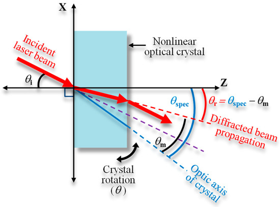 The diffraction of a laser beam is one of the optical properties that cannot be eliminated in verifying the proposed method due to crystal usage. In general, the incident laser beam that passes through the boundary of two media with different refractive indices will propagate following Snell’s law, as schematically shown in Figure 4 and expressed as follows.