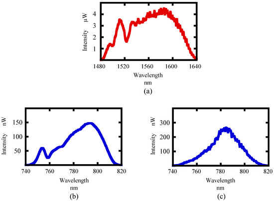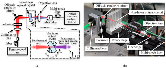 The experiment was performed to confirm the feasibility of the proposed method. A schematic diagram and a photograph of the experimental setup are shown in Figure 5a,b, respectively. A commercial femtosecond laser (C Fiber, Menlo System, Munich, German) was employed as the beam source with the following specifications: a center wavelength of 1560 nm, an average output power of 15mW, a repetition rate of 100 MHz, and a pulse width of 150 fs. The beam was emitted from the fiber-connected femtosecond laser and traveled through the collimating lens (F280FC-1550, Thorlabs, Newton, NJ, USA), the polarizer (LPNIR050-C, Thorlabs), and the off-axis parabolic mirror (f = 50.8 mm, MPD029-G01, Thorlabs). The SHW of the laser light focused by a parabolic mirror was generated in the optical crystal. The nonlinear optical crystal was mounted on the rotary stage as a demonstration measurement target, and the SHW and unconverted FW were both injected into the multi-mode optical fiber with the objective lens and transmitted to the optical spectrum analyzer (AQ6370C, Yokogawa Electric, Tokyo, Japan), where the optical spectrum was recorded.