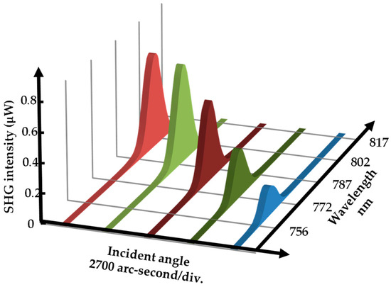 According to Equation (1), the highest SHG power can be achieved in the case of a sinc function equal to 1, that is to say, a phase mismatch condition equal to 0. To realize this condition, the incident angle of the laser beam must be set at a certain angle toward the optic axis of the nonlinear crystal, called the phase-matching angle. Thus, phase-matching conditions occur as Δk(θm) = 0 and no(λ1) = ne(θm, λ2). Since each nonlinear optical crystal has its specific phase-matching angle, it is necessary to estimate the matching angle of each crystal that satisfies with the following equations [39].