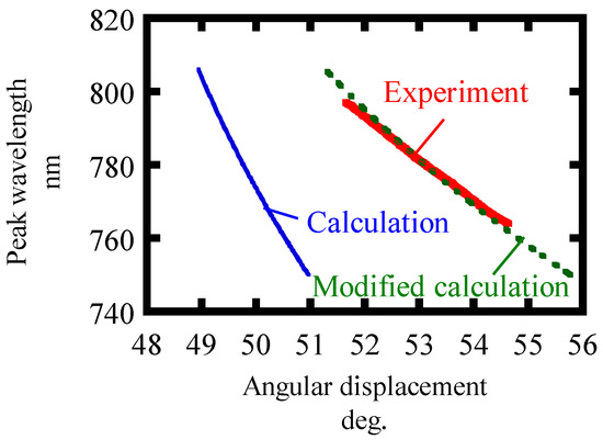 In order to obtain the resolution of the proposed method, we evaluated the noise level from experiments. Ten spectral measurements were made with a fixed rotary stage. The standard deviation of the center wavelength of spectra is shown in Table 5. Table 5 also shows the sensitivity of the proposed angular measurement method to angular displacements obtained from Figure 8 and Figure 9. In Figure 8, the slope of the modified calculation considering Snell’s law agrees well with the experimental results. Here, the experimental results are plotted in such a way that the angular displacement is consistent with the modified calculation at a wavelength of 780 nm. The resolution is defined by dividing the standard deviation of the noise by the sensitivity. A resolution of 3.00 arc-seconds was obtained. In addition, the dynamic range of the measurement method was also evaluated as a ratio of measurable range to resolution. Table 6 shows the characteristics of the angle measurement method in [25]. The angle measurable range is taken from 30% to 70% of the measurement response curve. The dynamic ranges of both measurements are comparable. Meanwhile, the advantage of the proposed method is that it has high measurement reproducibility because the observed wavelength is not affected by the intensity fluctuation of the FW which was unlikely in the previous research. By increasing the signal to noise ratio with higher incident FW power, an even higher resolution and dynamic range can be obtained. A supercontinuum source is another option to get a wider measurable range.