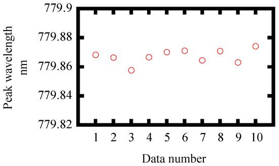Then, a feasibility study of the proposed angular measurement method based on second harmonic generation in the optical frequency domain was carried out. LiNbO3 was employed as a nonlinear optical crystal in the experiment. The properties of LiNbO3 used in this experiment are shown in Table 3. Figure 7 shows the picked experimental spectra observed when the target stage was rotated. The characteristics of the rotary stage are shown in Table 4. It can be seen that the spectral peak shifts with the rotational displacement of the rotary stage. Therefore, the central value of the spectra was evaluated using the following formula [42].