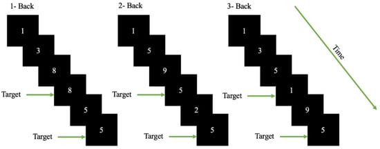 - Kane, M.J.; Conway, A.R.; Miura, T.K.; Colflesh, G.J. Working memory, attention control, and the N-back task: A question of construct validity. J. Exp. Psychol. Learn. Mem. Cogn. 2007, 33, 615. [Google Scholar] [CrossRef] [Green Version]