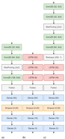 Model architectures for (a) CNN C-A (b) LSTM L-A (c) Conv-LSTM CL-A.