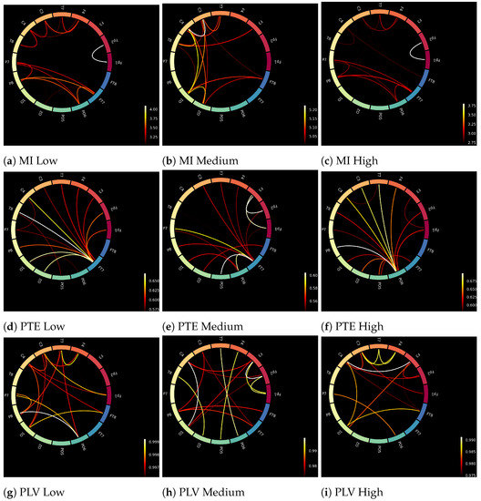 The input to the deep learning networks was 16 × 16 connectivity metrics. Sixteen brain regions were chosen from the brodmann atlas [] to cover the different brain regions and at the same time keep the computations as fast as possible. Figure 4 shows the differences (for a random participant) between low, medium and high workloads of MI, PTE and PLV, respectively. Although the differences among the three connectivity metrics are visible, there are no explicit and visible differences among the three workload conditions, i.e., low, medium and high.