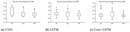 Box Plots representing the range of accuracy (with standard error) achieved by different subjects with deep learning architectures used (a) CNN (b) LSTM and (c) Conv-LSTM.
