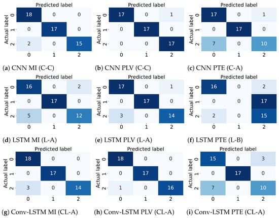 Confusion Matrix for the best performing subject for different combinations of the deep learning architectures (CNN, LSTM, and Conv-LSTM) and the functional connectivity metrics (MI, PLV and PTE).