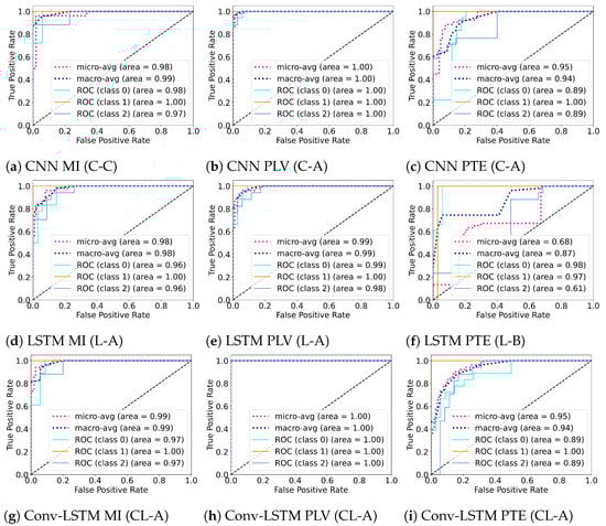 ROC (Receiver Operating Characteristics) curves for the best performing subject for different combinations of the deep learning architectures (CNN, LSTM, and Conv-LSTM) and functional connectivity metrics (MI, PLV and PTE).