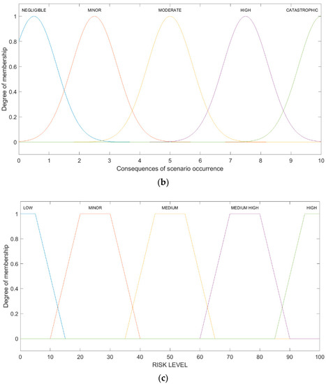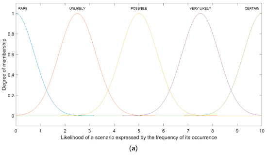 To correctly determine the probability and impact of each scenario, direct interviews were conducted with a group of experts who were, directly and indirectly, involved in the planning, organization, implementation, and supervision of the proper functioning of the customer’s inventory process. Linguistic variables were used to gather expert opinions on the parameters assessed. Then, these variables were modeled using the fuzzy set theory. According to this theory, the risk parameters of each scenario (in the case of the problem being solved: consequences and the level of risk) are treated as a fuzzy number (FN) and the membership function (MF) is related directly to it. Membership functions can take many shapes. The choice of the body for a specific fuzzy set (language value/attribute) is subjective and depends on the problem being solved. The presented risk assessment method proposes the use of MF Gauss (probability of the scenario and consequences of the scenario) and the trapezoidal MF (level of risk).