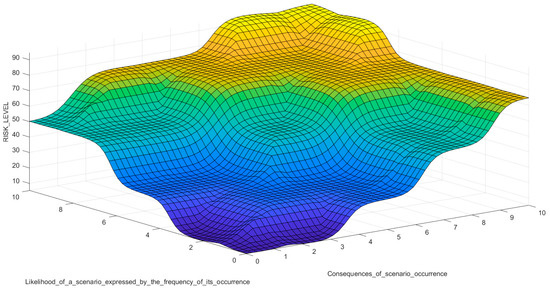 The operator’s action is limited to selecting a computing system (SUGENO or MANDANI), defining a membership function and defining rules. This has a noticeable impact on the obtained test results. In addition, we should pay attention to one more feature of the FLD module itself. In SUGENO systems, the output range is uniquely defined by the range and type of input membership functions. Therefore, the choice of the starting range does not affect the course of the surface. This approach should be considered a limitation for SUGENO systems as the output data are not fuzzy sets. For systems using the MAMDANI algorithm, the output depends on both the input and output MF because both inputs and outputs are fuzzy sets. The output signal range should typically be selected to contain the cumulative values of the minimum and maximum values of all output MF. A comparative analysis of the research results obtained using two different computational systems will also be the subject of future research by the authors. To confirm the correctness of the MF input choices, the Results section, apart from the control surface plot, also presents the dependence of individual model input signals on the obtained output Risk Level index results.
