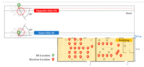 In Figure 1, a basic layout of both scenarios is illustrated; for same side (SS) links, the transmitter system was always placed on the sidewalk 0.7 m away from the building wall, and for opposite side (OS) links, it was moved directly across the street from its previous location. Throughout the different transmitter system settings, it was located at a 5 m height with a 60° depression angle to the wall. The transmitter power of the system was 17.8 dBm () at a 3.5 GHz continuous wave (CW) and it consisted of a vertically polarized directional patch antenna with 10.2 dB gain (), 60° azimuth and elevation half-power beamwidths. The received power was recorded by a narrowband receiver connected to a vertically polarized half-wavelength dipole with a 2.4 dB gain (). The receiver bandwidth of 200 KHz allowed it to capture any frequency dispersion affecting the CW transmission. In all field measurements the received power was at least 20 dB above the receiver noise floor of −123 dB.