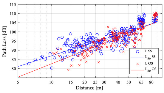 In Figure 5 the path loss extracted from (2) is illustrated in blue circles markers for the SS links and in red cross markers for the OS links (where the marker points are already averaged over all 60 samples per received position) along with the median path loss calculated by (4) with the values presented in Table 4 for the SS and OS NLOS O2I links.