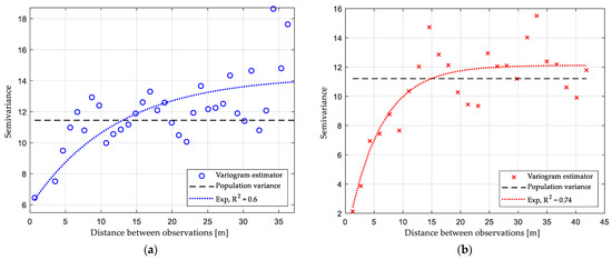 To provide these predictions, Kriging employs the variography to understand and find a pertinent threshold of neighboring samples to the interpolation. In order to summarize the central shadowing tendency, an exponential model function is fitted to the variogram estimator to further visualize the shadowing spatial process. The selection of the exponential function is focused on both theoretical reasons, which highlight the properties that a function selected as a variogram model must fulfil, and practical reasons, for which evidence from multiple studies [15,24,25] demonstrates that the exponential function provides the best fits.