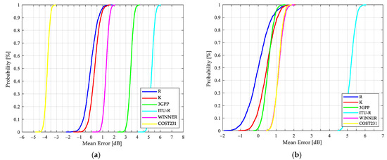 CDFs of mean error for path loss predictions based on different models: (a) SS O2I links; (b) OS O2I links.