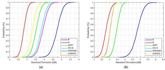 CDFs of standard deviation for path loss predictions based on different models: (a) SS O2I links; (b) OS O2I links.