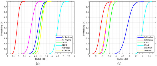 CDFs of RMSE for path loss predictions based on different models: (a) SS O2I links; (b) OS O2I links.