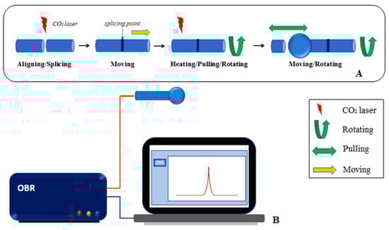 Experimental set-up used in this study; (A) fabrication of ball resonator sensor on a CO2 splicing machine; (B) interrogation of the sensor with optical backscatter reflectometer.