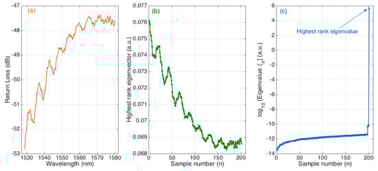 Overview of the operation of the undersampled KLT applied to the spectrum of a ball resonator. (a) The reflection spectrum of the ball resonator, acquired by the OBR and processed. (b) The eigenvector corresponding to the highest rank eigenvalue, acquired over 201 samples. (c) Eigenvalue string, reporting the magnitude (in logarithmic units) of all 201 eigenvalues sorted in ascending order.
