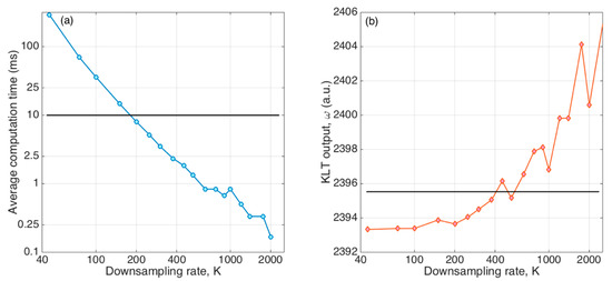 Performance analysis of the KLT as a function of the undersampling rate K. (a) Average computation time over 100 KLT calculations as a function of K; the horizontal line shows the limit of 10 ms computation time for rapid computing. (b) KLT output ω as a function of K; the horizontal line shows the limit of 0.1% variation of ω from the reference value computed with K = 45.