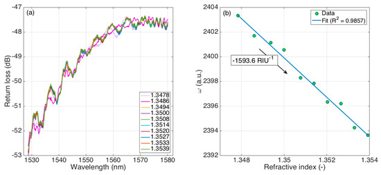 Refractive index sensitivity of the ball resonator interrogated with the KLT method. (a) Reflection spectra of the ball resonators, for different RI values ranging from 1.3478 to 1.3539. (b) KLT output ω as a function of the RI; the linear fit shows the sensitivity as −1593.6 RIU−1.