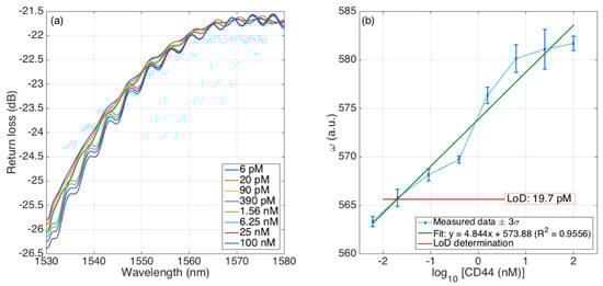 By processing the spectral envelope with the undersampled KLT, on the other hand, we obtained a much clearer response; this is shown in Figure 7b, where we report the change of ω as related to the CD44 concentration change. Hereby, the datapoint represents the average of the sensor response over 10 min of acquisition, while the error bars report ±3 times the standard deviation, as commonly performed for fiber optic biosensors [1].