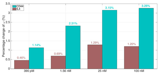 The results of the specificity analysis are shown in Figure 8, where we compare the change of KLT output ω from the reference condition (6 pM) observed for both CD44 and control IL4. We observe that the response to control is approximately 2.5 times inferior to the response to CD44, which validates the concept of the sensor. The specificity, observed between 390 pM and 100 nM, ranges from 30% to 41%, computed as the response to control normalized by the response to the CD44 analyte. This value is in analogy with other CD44 biosensors with lower signal (impedance decrease rate and current change, respectively) for control proteins [31,32], but these sensors were capable of working at lower concentrations.
