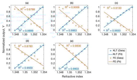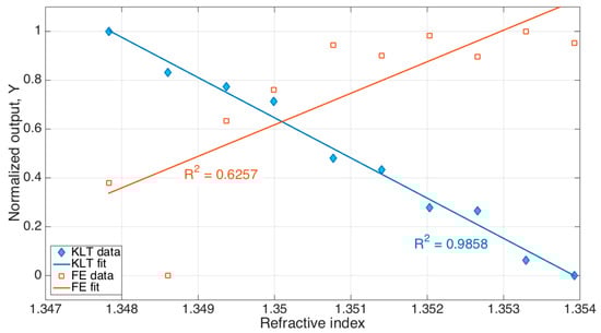 Comparison between KLT and feature extraction (FE) methods for demodulation of the ball resonator. The chart shows the normalized output (Y) as a function of the RI, obtained for each method. Datapoints have been interpolated with a linear fit; the R2 coefficient of determination shows the quality of the agreement between measured data and the fit.