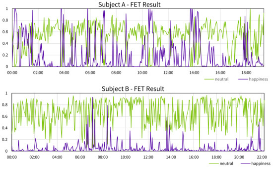 In the past, our research group developed a real-time emotion analysis service “Face Emotion Tracker (FET)” using a cognitive API and attempted a quantitative evaluation of care []. In this previous study, care using a virtual agent [] was conducted for 5 elderly people living in an elderly facility. During care, FET captures pictures of a subject and sends them to a cognitive API (Microsoft Face API []) to analyze the emotion. A part of the result of the FET experiment is shown in Figure 1 as time-series graphs (some outliers has been eliminated). FET outputs 8 kinds of emotions (“anger”, “contempt”, “disgust”, “fear”, “happiness”, “neutral”, “sadness”, “surprise”) from 0 to 1 as probabilities, this time, paying attention to the values of “neutral” and “happiness”. Subject A was relatively expressive, and the values of “neutral” and “happiness” appear alternately during care. Subject B was 99 years old, and the change in facial expression was not so apparent because of the decline of facial muscles. As a result, in contrast to subject A, only neutral was observed at almost all timings. However, the accompanying person who observed the subjects evaluated that subject B felt better and better as the care progressed. Therefore, it can be said that there was a gap between the obtained results and the actual ones. Thus, the reliability of the result of emotion analysis with cognitive API may be degraded depending on the characteristics of the subject.