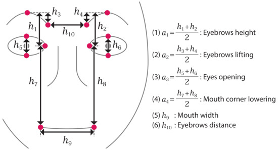 When observing the facial expressions of care targets, many cases of people with poor facial expressions for their actual emotions will be encountered. The factors involved are aging, dementia [], the sequela of stroke [], Amyotrophic Lateral Sclerosis (ALS) [], Parkinson’s disease [], and so on. Hence, taking some measures will be needed. In addition, the cognitive API which FET used is built with machine learning technology. Therefore, the process in which a result is outputted from an input cannot be followed. As a result, we may face difficulty when using the obtained data as evidence for the effect of care. To capture scientific evidence in elderly care, facial expressions are regarded as an objective indicator of the effects of care, which led to proposing a user-defined facial expression sensing service in the previous study []. The facial expression sensing service extracts the coordinates of characteristic parts of the face (i.e., feature points) such as eyebrows, eyes, and mouth from the face image. Then, the service measures the length connecting two feature points as a feature value and records it as time-series data. By tracking the change of these values, the degree of facial expression change from facial movement can be measured. As a result, even when the person shows only a subtle facial expression change, the service will be able to measure and record it as opposed to overlooking it. The aim of this paper is to contribute to explicable emotion analysis and quantitative evaluation of care by examining the degree of facial expression change as clear numerical values and inferring the emotional changes associated with the movement of facial expression.