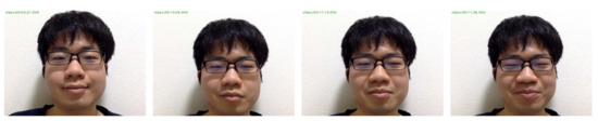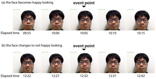 In this experiment, the ratios and were first calculated to estimate how much more efficient the facial expression analysis becomes. Here, n is the number of whole data; is the number of PoIs, and is the number of data exceeding the threshold . The smaller these values are, the fewer the number of data to be checked, and the more efficient the analysis will be. Next, to confirm the validity of the obtained PoI candidates, the timing of facial expression changes recorded by eye observation was compared with them. First, we looked for the timing, as shown in Figure 6, when the face (a) becomes happy looking and (b) changes to not happy looking by visual inspection, and recorded them as “event point”. In this experiment, event points were recorded only when obvious facial movement was seen. For example, gradually returning from a smiling face to a neutral face over a long period, about 30 s to 1 min was not recorded because it was difficult to determine where to place an event point. Next, PoI candidates were picked whose timing matched an event point, and we defined it as a correct PoI and defined its number as a number of correct. In this experiment, if a PoI candidate was within 10 s before or after an event point, it was considered that they are matched. Note that a number of correct will be counted only once for each event point. Then, for the number of PoIs , the number of correct , and the number of event points , the following ratios were checked.