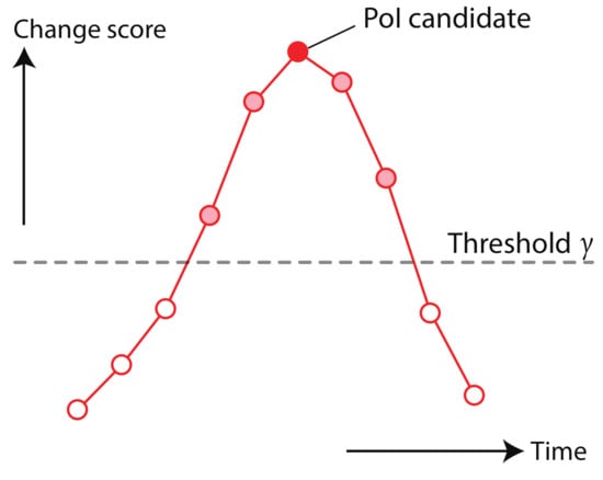 We attempted to extract PoIs for single feature values and composite features value Smile scale, using Change Finder on the test data created from the face of this thesis’ author and data obtained from facial images of elderly people receiving care. In this experiment, we use the Change Finder library for Python []. The library takes the following parameters: order of the AR model , discounting rate r, and width of smoothing size w. These parameters are used directly for the first AR model training. In the second AR model training, the width of the smoothing size will be round(w/2.0). In each experiment, the parameters are set to , , and . Among the change scores calculated by the Change Finder, as shown in Figure 5, we define the point t with the highest score as the time between the score exceeding a certain threshold and it falling below the threshold as the PoI candidate. By examining the appearance of the face around PoI candidates, we can confirm whether an obtained PoI candidate is a valid as PoI. In this series of experiments, we determine the threshold by using the mean and standard deviation of the change score S.