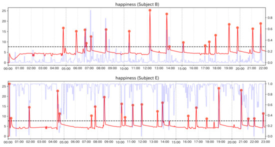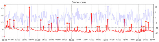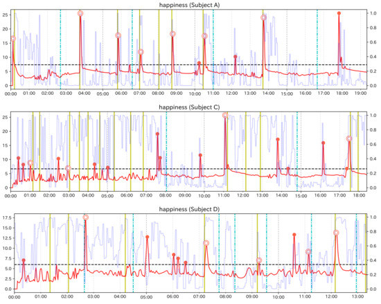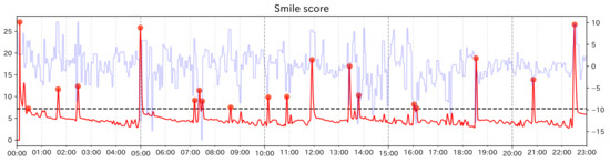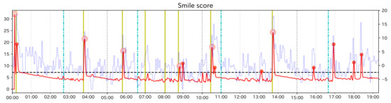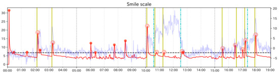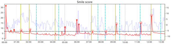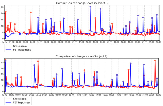 In this experiment, was lower than 0.1 for all subjects, which means that we were able to focus on the important data, significantly, the FET data as well as the data from the Facial Expression Sensing Service. In subject group 1, for subjects A and D, Recall and Precision were higher than those with feature values. For subject C, the result was not good. If the data tend to keep high or low values, as in the case of subject C, the subtle changes will be lost and PoIs will not be detected well. For subject group 2, the change score run along with the change in the value of “happiness”. The value of “happiness” is almost always around 0 or 1, and it tends to change sharply at some moment. Therefore, such instantaneous value is mainly detected as a PoI candidate, and the detailed changes in facial expressions at other moments are lost. Moreover, we compared the change scores and PoI candidates for each subject in subject group 2 with those using the Smile scale. The result are shown in Figure 15. From these graphs, it can be seen that there are some gaps in the timing of the PoI candidates between the two cases. The gaps are especially seen in subject B. This suggests that by using the data from the Facial Expression Sensing Service, it is possible to perform different analyses of the case using FET data. From these results, we conclude that the analysis based on the method of this experiment can be used for FET data for expressive people. For the people with poor facial expression, we will be able to conduct care analysis based on subtle facial changes that cannot be captured by FET by using the data of the Facial Expression Sensing Service.