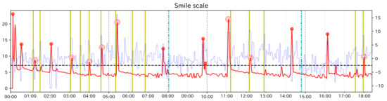 As a comparison with the method of this experiment, the PoI candidates were extracted and each scale calculated using the raw values of the Smile scale. As in the case in which the change score was used, the timing with the highest value exceeding a certain threshold was considered as a PoI candidate. We set the threshold value to using the mean and standard deviation of all Smile scale’s raw values. The results are shown in Table 3. When we set the low threshold (), the values of and were much higher than those using the change score. Moreover, many PoI candidates were detected, and although Recall was high, Precision was low. When we set the high threshold (), the number of correct decreased and the precision was low because small changes were ignored. In the case of , although Recall was relatively high, many PoI candidates were detected in the areas where Smile scale value wiggled, and the precision was lower than that using the change score. From this, it can be said that using the change score is more efficient and accurate than analyzing the raw feature data while changing the threshold value.