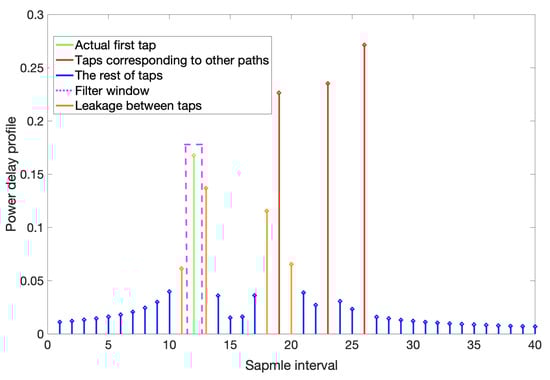 We use the tapped delay line model to characterize the frequency-selective channel, and each tap represents a different channel delay in units of the sampling interval of the receiver. Figure 1 shows a schematic of the window at . Based on the correlation of the transmit sequence, the terminal can determine the arrival delay of the direct path. The manipulation of the power delay profile further eliminates the effects of multipath. Additionally, it is worth noting that actual distance to the BS in this example is 12.4 sampling intervals. Due to the limitation of the system sampling rate, the TOA obtained by the cross-correlation algorithm is 12 sampling intervals, which generates a significant measurement error. Furthermore, as shown in the figure, the distance is a non-integer multiple of the sampling interval resulting in leakage between taps.