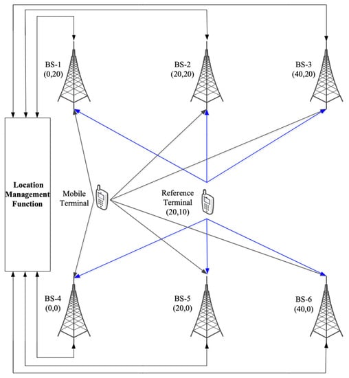 Equation (25) shows the and are not impacted by the receiver and the transmitter clock biases. It is worth noting that the reference device can be either a UE with a known exact location or a BS. For some positioning scenarios, the deployment of additional hardware can cause a significant overhead; therefore, 3GPP has agreed on selecting the reference device, i.e., the device with the known location can be a UE and/or a BS (also known as evolved gNB) [].