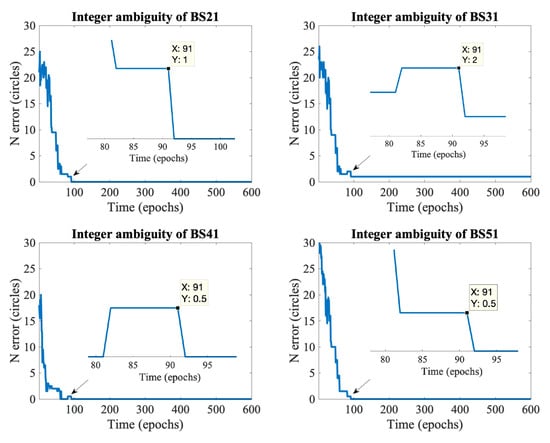 Equation (25) shows that the SD carrier phase measurement contains the DD integer ambiguity . Therefore, we use the DD integer ambiguity for performance comparison. Define the integer ambiguity estimation error as: